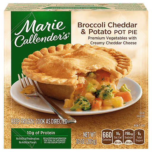 Put the taste of homemade flavor on your kitchen table with Marie Callender's Broccoli Cheddar and Potato Pot Pie. This satisfying and hearty frozen pot pie features premium vegetables including broccoli, potatoes and carrots with a savory, creamy cheddar cheese sauce, all surrounded by a golden, flaky crust that's made-from-scratch. Enjoy a homestyle microwave meal that includes 10 grams of protein, with no preservatives and no artificial flavors. Heat this comforting frozen vegetarian pot pie in the conventional oven or microwave for an easy-to-prepare pot pie dinner that's sure to satisfy. Enjoy warm, hearty ingredients and delicious homemade comfort food taste with Marie Callender’s.