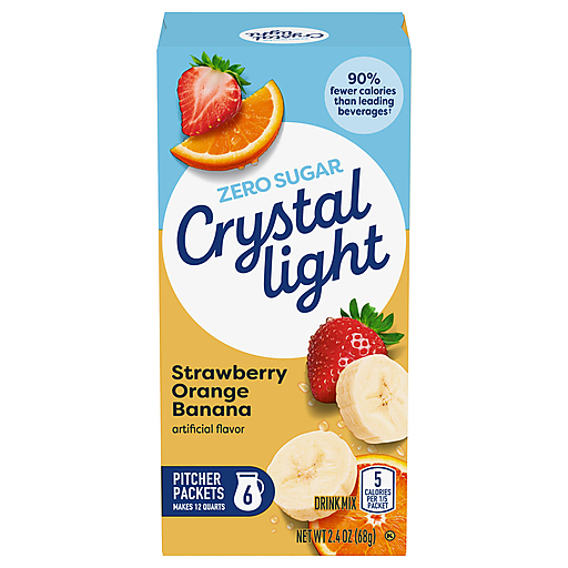 Crystal Light Artificially Flavored Strawberry Orange Banana Powdered Drink Mix is a refreshing beverage you can enjoy at any time of day. With zero grams of sugar and only 5 calories per serving, Crystal Light is a sweet alternative to juice and soda and has 90 percent fewer calories than leading beverages (this product 5 calories, leading beverages 70 calories), so you don't have to choose between taste and calories. It features fruity flavors for a refreshing taste. Each pitcher packet of powdered strawberry orange banana drink mix in this 6 count canister is perfectly portioned to make 2 quarts or 1 pitcher of Crystal Light, so there's plenty to share with family and friends. Simply mix one drink mix packet with 8 cups or 2 quarts of water, stir and enjoy! All the flavor and only 5 calories, just the way you like it.