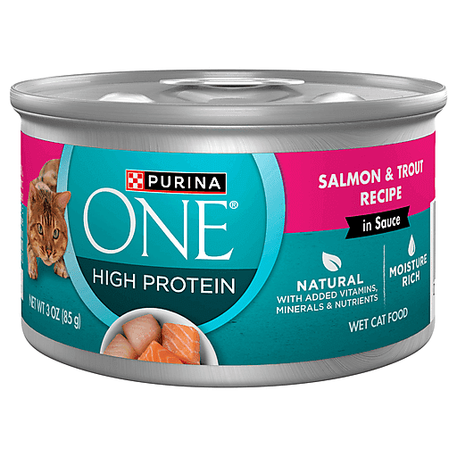 Feed your cat high protein nutrition with Purina ONE High Protein Salmon and Trout Recipe in Sauce wet cat food with added vitamins, minerals and nutrients high quality cat food. This tasty natural cat food combines two delicious protein flavors to tempt your cat's taste buds. Serve your cat this moisture-rich Purina ONE High Protein cat food to help support healthy hydration. Natural with added vitamins, minerals and nutrients, this healthy cat food contains real salmon and trout, along with other high-quality ingredients that give her all the purposeful nutrition she needs for lifelong whole-body health. Purina formulates this recipe to provide 100 percent nutrition for all life stages and 0 percent fillers, meaning every ingredient has a purpose. Plus, this Purina ONE High Protein Salmon and Trout Recipe contains high protein to help support strong muscles. Give your cat great taste from a veterinarian-recommended brand with this delectable high protein cat food from Purina ONE.